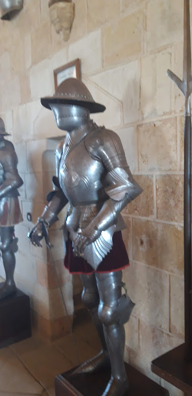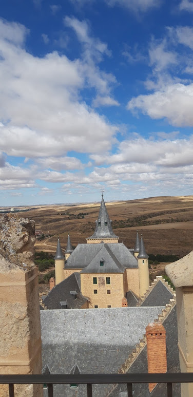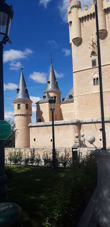 Met zijn torentjes en ligging op een rots doet het denken aan een fantasiekasteel waar Doornroosje zou kunnen slapen. Waarschijnlijk zag het er in de tijd van Isabel minder sprookjesachtig uit dan nu — soberder en functioneler. De huidige torentjes en gevels zijn deels het resultaat van latere romantische restauraties. Ook zal het er van binnen heel anders hebben uitgezien. We dwalen door de zalen en bewonderen het houtsnijwerk van de plafonds, vaak in mudéjar-stijl. In de Sala de los Reyes (Zaal van de Koningen) bezorgt het houten cassettenplafond, met de portretten van 52 Castiliaanse vorsten, me bijna nekpijn van het omhoog kijken. Tijdens de rondleiding zien we veel originele stukken uit Isabels tijd: wapens, harnassen en meubels die ooit deel uitmaakten van de koninklijke schatkamer.  Of ze allemaal werkelijk tot Isabels persoonlijke bezit behoorden, is niet waarschijnlijk, maar ze geven wel een goed beeld van het hofleven in de tweede helft van de vijftiende eeuw.